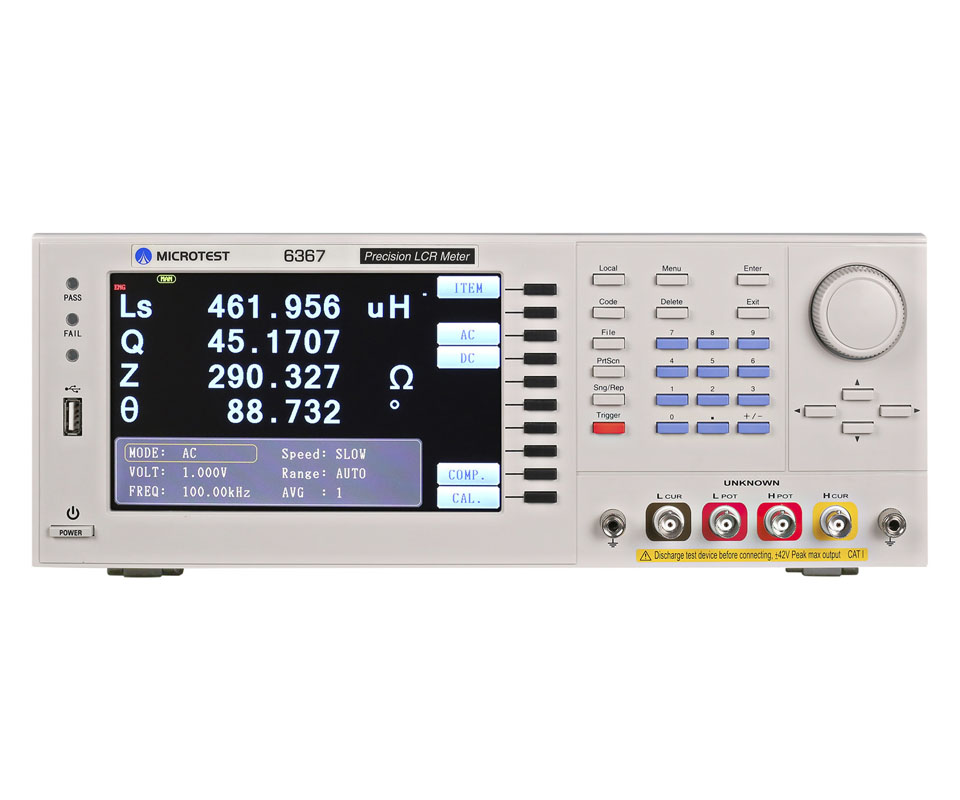 6367經濟型 LCR 電橋具備高精確度、速度,且經濟型多功能,測試頻率范圍從10Hz~1MHz。基本精確度±0.05%,螢幕畫面可以同時顯示四個參數。具多步列表功能,最多可以設定8組。低頻率6365A(0.1Hz~200kHz)可量測容量大的鋁電解電容。支援USB Host、RS-232、GPIB、Handler、LAN等介面。可選購電腦連線軟體進行圖形繪圖分析。適用于生產制造、品保或進料檢驗或自動化檢測部門。